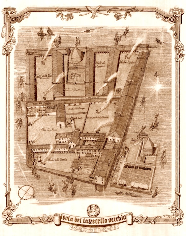 The island of Lazzaretto Vecchio in the lagoon of Venice is the site of the world’s first quarantine. From 1403 to 1630, when successive waves of plague ravaged Italy and the rest of Europe, visitors to the wealthy and prosperous merchant republic of Venice were required to remain on the island for forty days until their health condition could be made known, the idea being that during their confinement, any disease they were carrying would manifest itself. The goal of the Republic was to safeguard its citizens from contagious disease. Even though contemporary society was unaware of the exact mechanism of transmission of various illnesses, long observation had taught them that people exposed to the sick often fell ill themselves.